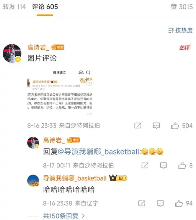值得一提的是,作为男篮首发后卫的高诗岩,在本赛季自己竞技状态以及球队战绩不佳的情况下,屡屡发出惊人言论,如“比赛失利不应由一个人来承担责任,所有人都要反思”,如直接怒怼球迷“真是对你们无语了,还要怎样?”最离谱的是他之前还公开嘲讽徐杰。球迷一致认为,不仅球商低情商更低。广东打山东,高调的高诗岩自然被拿来和徐杰对比,结果一比就露馅,所谓的国家队首发后卫被徐杰彻底打爆。两人之间的差距可能隔了一个王岚嵚。