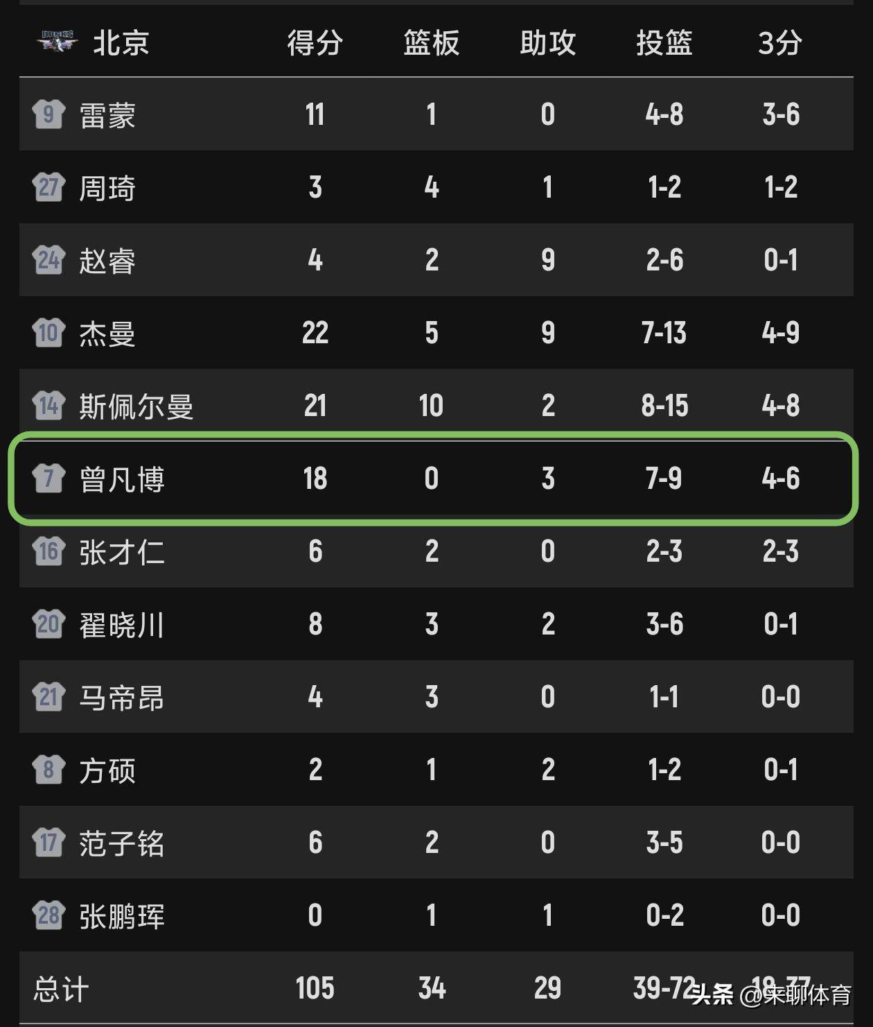 实话实说,曾凡博这场比赛的确不错,第一节5分打破比分僵局,狂砍18分,投篮9投7中,命中率高达78%,三分球六投四中,命中率67%,两次抢断,一次盖帽,三次助攻,个人得分数据这一块是非常的优秀。
