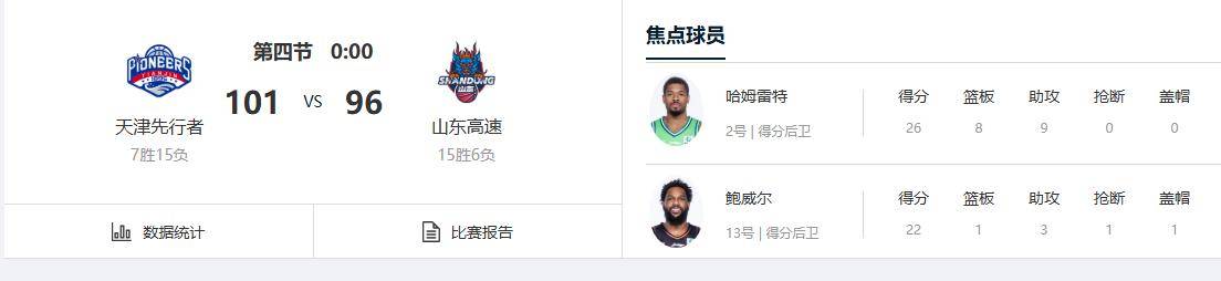下半场易边再战,天津队下半场攻势不减,山东不断调整阵容始终无法打出反击势头,天津队则是稳定发挥始终领先20分以上,本节末端山东一波流追到还差15分打停天津,三节战罢山东落后11分。末节决战,天津队开局连中三分扩大领先,山东则是缓慢追分,比赛还剩1分钟山东追到还差5分,随后于德豪连中两记三分,山东追到还差2分,哈姆雷特两罚全中稳住领先,陶汉林强攻篮下打进,最终山东96-101不敌天津,这场爆冷也是典型以下克上!