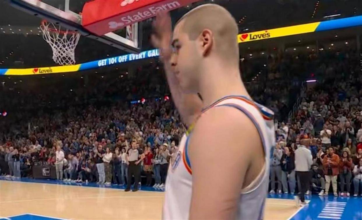 这场比赛除了冷门和排名更迭,还有一个温暖人心的故事。在第一节比赛还剩1分55秒时,雷霆队2024年的首轮12号秀尼古拉·托皮奇替补登场,迎来了他迟到了近两年的NBA生涯首秀。全场球迷起立鼓掌,向这位年轻人致以最崇高的敬意。托皮奇的篮球之路异常坎坷,他在2024年选秀后被雷霆选中,但因右膝前十字韧带撕裂缺席了整个2024-25赛季。更不幸的是,在去年10月,他被诊断出患有睾丸癌。经过四个月的手术和化疗治疗,托皮奇成功战胜了病魔,重返球场。第二节比赛进行到8分59秒时,他借助霍姆格伦的挡拆,急停中投命中,打进了个人NBA生涯的第一球。那一刻,全场再次爆发出热烈的掌声和欢呼声,就连因伤缺阵的亚历山大和杰伦·威廉姆斯也从替补席上站起来为他鼓掌。全场比赛,托皮奇出战12分22秒,3投1中得到2分1篮板1助攻。赛后,雷霆主帅戴格诺特动情地说:“我真的为他感到无比开心。今晚让他穿上球衣,目的就是让他第一次体验穿比赛服的比赛日氛围。但对他来说,这已经是巨大的成就了。”队友霍姆格伦也表示:“他是在为自己的生命而战。他在康复路上拼尽全力,然后还要走上球场,打一场篮球比赛。这需要多大的勇气,他正在追逐自己的梦想。”