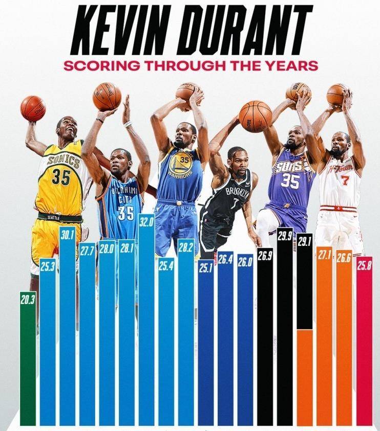 对于杜兰特而言,挑战不仅在于年龄。 他曾在2019年遭遇跟腱断裂的重伤,但复出后仍连续五个赛季保持场均25分且线%以上的表现。 本赛季,他的投篮命中率达到52.4%,真实命中率甚至超过了他四个得分王赛季的水平。 他的中距离投篮尤其致命,是近29年唯一一位5次做到“单赛季中距离出手超200次且命中率超50%”的球员。