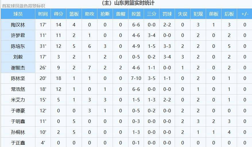 所有十二名上场球员都有上场时间,并且五人得分上双,除了陈林坚的18分外,老将陶汉林贡献14分,许梦君得到11分,陈培东表现全面,取得12分5个篮板6次助攻和3次抢断,尽管他的投篮手感仍有些欠缺,三分球5投1中,状元谢智杰拿下9分7次助攻。而新援常浩然6投全中,拿下12分,表现出色,作为家喻户晓的球员,他的表现也许证明了邱彪引进他的合理性。
