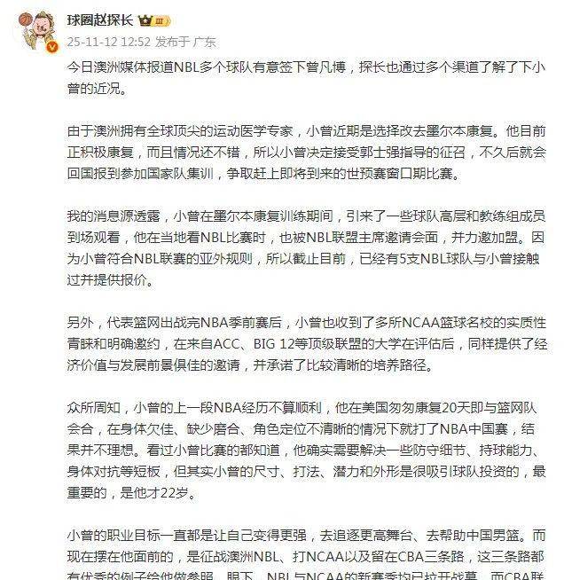 然而,曾凡博面临严峻的时间矛盾。中国男篮将于11月28日在五棵松主场迎战韩国,而CBA、NBL、NCAA新赛季均已开启。若选择海外联赛,他需尽快签约合练;若回国备战世预赛,仅剩不足3周磨合期。最终,他选择优先响应国家队征召。这一决定与其职业生涯目标一致——此前他在采访中强调“希望为国家队出战”,此次康复期间也多次表态愿为国效力。