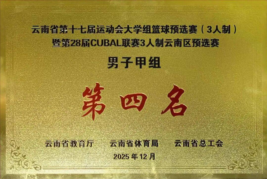 本次赛事汇聚了云南省各高校的顶尖篮球队伍,竞争异常激烈。其中,高校男子乙组(专科)由程香老师担任领队,曹冲、裴向龙老师担任教练,队员们默契配合、攻防兼备,凭借精准投篮、严密防守和灵活战术部署一路过关斩将,最终荣获季军;高校男子甲组(本科)由曹冲老师担任领队,陈文华、裴向龙老师担任教练,队员们在高强度对抗中顶住压力、奋勇争先,以扎实的技术功底与坚韧斗志拿下第四名的好成绩。