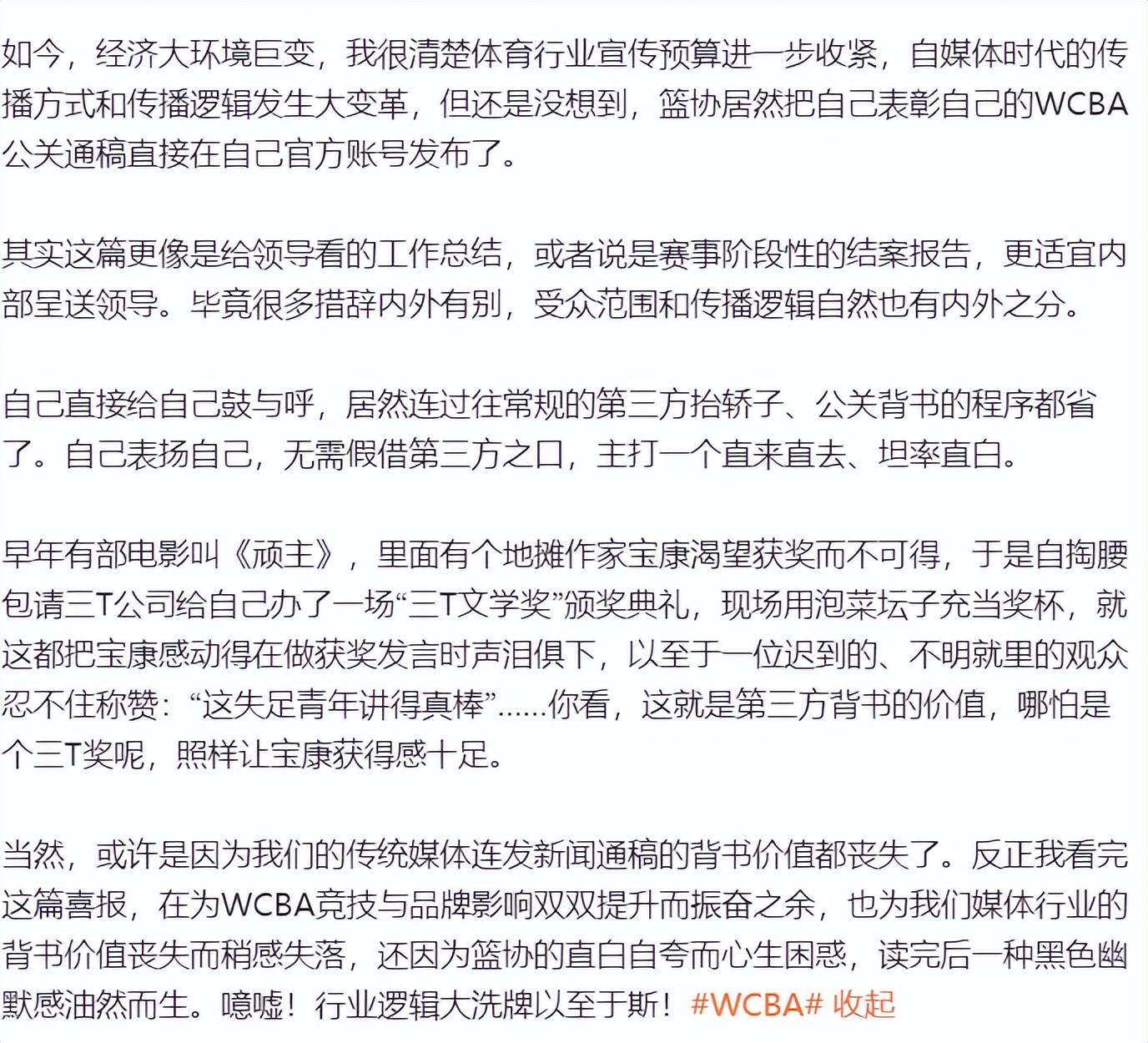 但后来随着自媒体时代的到来,传统媒体的力量也削弱很多,但像篮协这种自卖自夸的行为还是令人觉得非常搞笑。