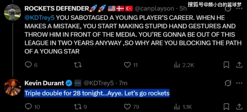 对阵黄蜂一战,杜兰特曾炮轰申京该努力防守,这让很多火箭球迷炮轰杜兰特认为KD影响了申京的成长,一位球迷写道:你毁掉了一位年轻球员的职业生涯。他犯错时,你便做出愚蠢的手势,还把他推到媒体面前。反正你两年后就会被联盟淘汰,何必阻碍一位新星的成长之路?