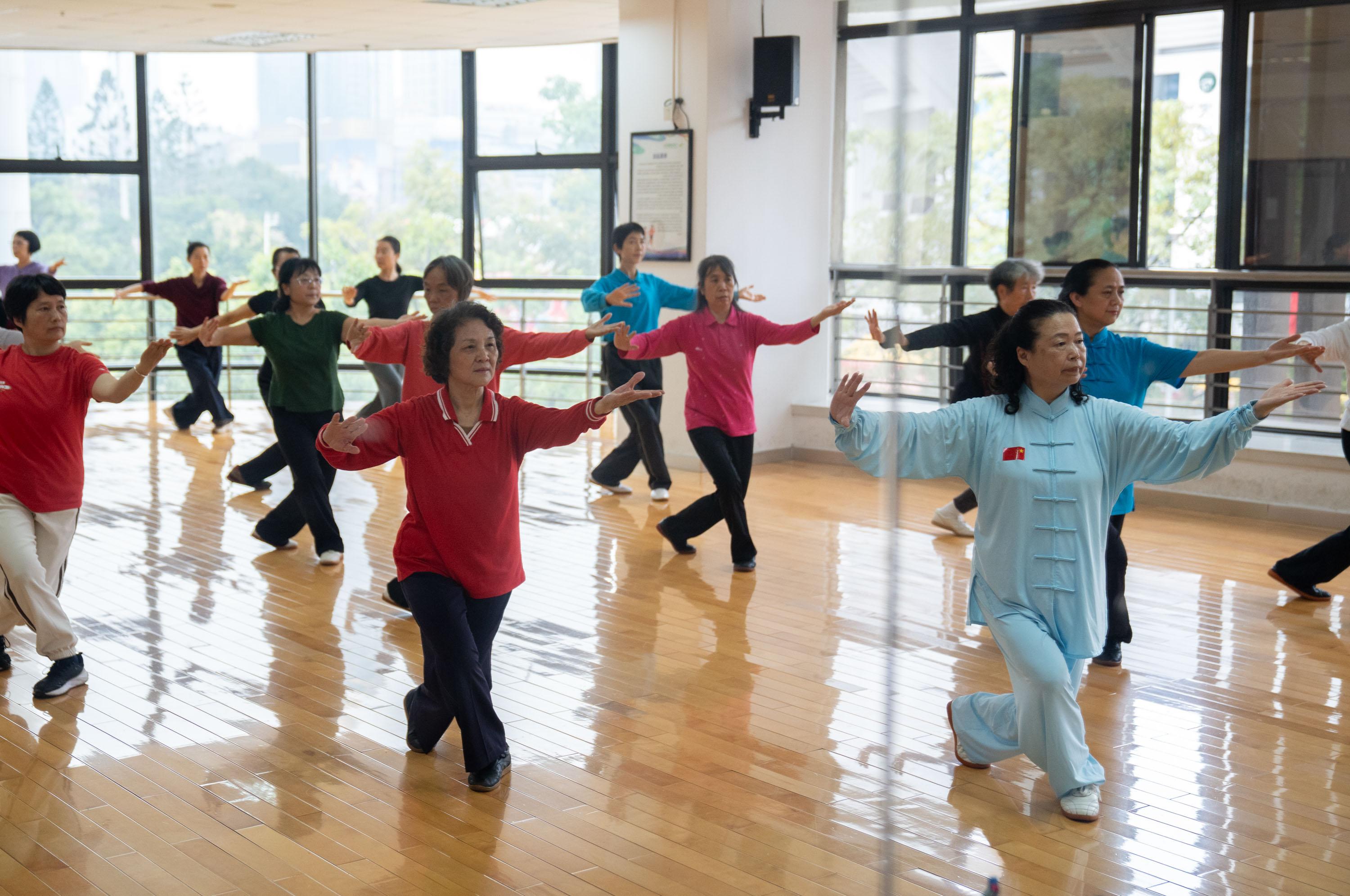 在全民健身中心的三楼练操房,广州市太极拳协会副会长韩巧云正带着学员操练八法五步,大家在每一次缓慢的抬手落足中沉浸于身心合一的松弛感。“春节期间的太极拳、瑜伽和普拉提等惠民课,深受市民的欢迎,我的课每次都报满,春节假期的课更是很早被抢光。”